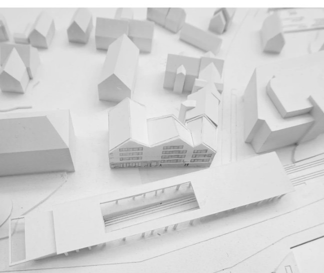 Bei dem zu errichtenden Gebäude handelt es sich um einen Baukörper mit polygonalem Grundriss und drei Giebeln. Im Bereich der Hohenloher Straße wird das Gebäude an ein Bestandsgebäude angebaut. Der Westliche Gebäudeteil wird auf der bestehenden Tiefgarage erstellt. Der Baukörper besteht aus zwei Untergeschossen, drei Vollgeschossen und zwei Dachgeschossen. Durch einen Aufzug im innenliegenden Treppenhaus werden alle Geschosse barrierefrei erschlossen.
